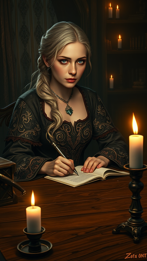 A fair-haired woman in an ornate medieval gown sits at a wooden desk, penning a letter by the warm glow of flickering candles. Her expression is serene yet contemplative, as shadows dance around her, creating a mystical atmosphere. The scene captures a fantasy world filled with intricate details reminiscent of behance fantasy concept art. With a style reminiscent of the works of Wojtek Fus and Magali Villeneuve, the portrait embodies a blend of elegance and strength akin to fan-favorite characters from the Witcher universe. The artwork is presented in rich 4k resolution, showcasing the woman's striking features and the elaborate textures of her attire. In an epic fantasy art style, she embodies a character from a high-fantasy game, her presence commanding, her surroundings steeped in lore, making it a masterpiece suitable for the best collections on ArtStation.