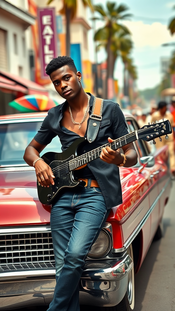 A fair-skinned shorthair musician leans against a classic Cadillac, radiating confidence on a bustling colorful street.