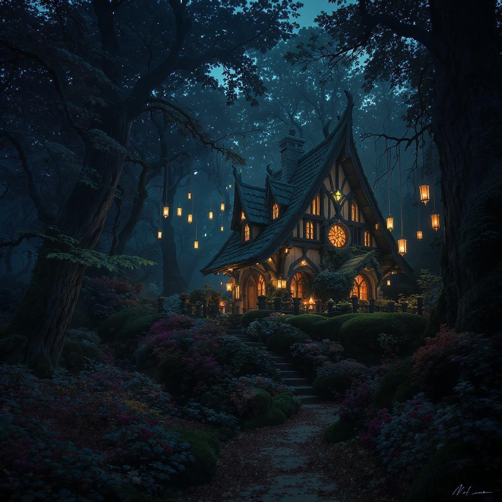 A fairytale wonderland unfolds in a mystical forest where nature thrives with enchanting vigor; at its heart lies a small, magical wooden house that exudes charm and mystery. The environment is cloaked in darkness, save for the warm glow emanating from the lit house and delicately hung lanterns that create an ethereal ambiance. This picturesque scene offers a symmetrical view, highlighting the incredible architecture of the house, crafted with intricate wooden details that captivate the eye. Surrounded by the bloom of unseen flora, the atmosphere is further enhanced by gentle light rays filtering through the trees, casting ambient occlusion that creates a sense of depth and realism. The overall photorealism evokes cinematic beauty, capturing every fine detail in what resembles a raw photo, elevated by a touch of magical wonder.