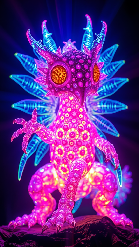 A fantastical creature composed entirely of vibrant neon rays, exhibiting ultra-detailed features under a magical, fairy-like glow; its form illuminated by bright, kaleidoscopic colors with volumetric beams of radiant light cascading around it. The scene is captured in photorealistic detail with HDR, enhancing the mesmerizing interplay of light and shadow, set in a 9:16 aspect ratio.