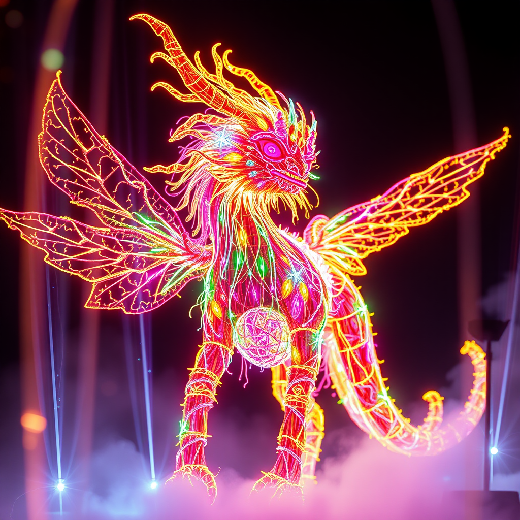 A fantastical creature composed of vibrant neon light strands, intricately detailed with fairy-like illumination, exhibiting a photorealistic appearance. The creature glows with a rainbow of bright colors, surrounded by ethereal, volumetric beams of light that lend a mystical aura. Captured in high dynamic range, the scene is set in a vertically oriented aspect, enhancing the creature's towering, majestic presence against a dreamy backdrop.