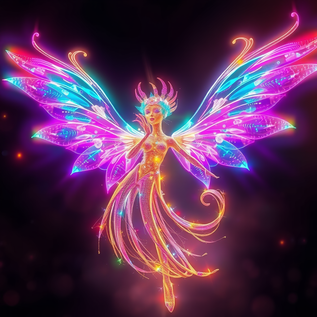 A fantastical creature crafted from vibrant neon rays, intricately detailed with fairy-like illumination, conveying photorealism with a spectrum of bright colors, surrounded by volumetric beams of light, captured in HDR, set against a dreamy, ethereal backdrop, where the elongated form dances gracefully in a mesmerizing display of luminescence and vibrant hues, embodying both mystical elegance and surreal beauty.