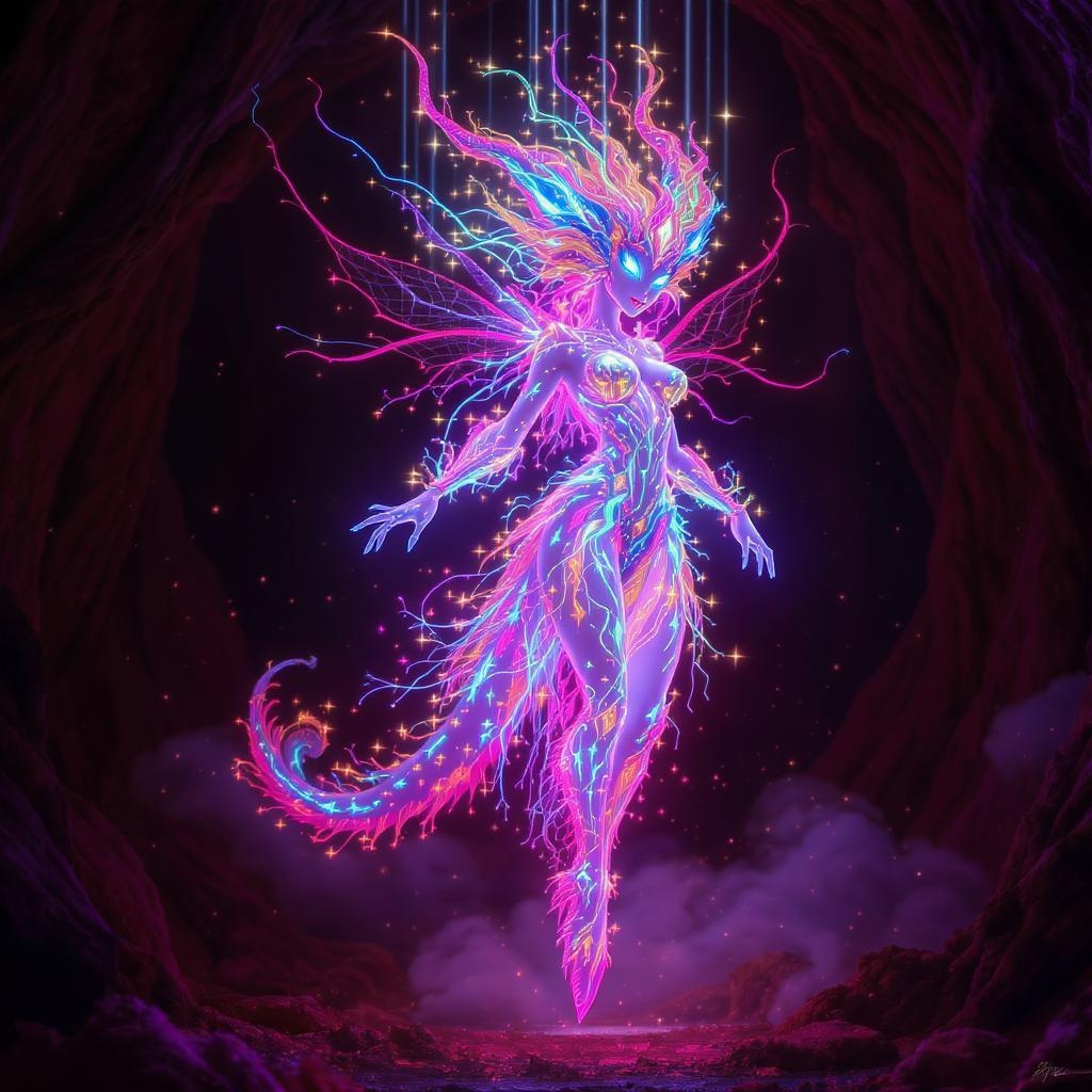 A fantastical creature crafted from vibrant neon rays, exquisitely detailed with ethereal fairy-like illumination, exhibiting photorealistic features. The creature glows with intense, bright colors, surrounded by volumetric beams of light that enhance its aura. Its form is elongated and elegant, casting a mesmerizing presence in an HDR-like setting, capturing the essence of a dazzling, luminescent entity in an elongated 9:16 ratio.