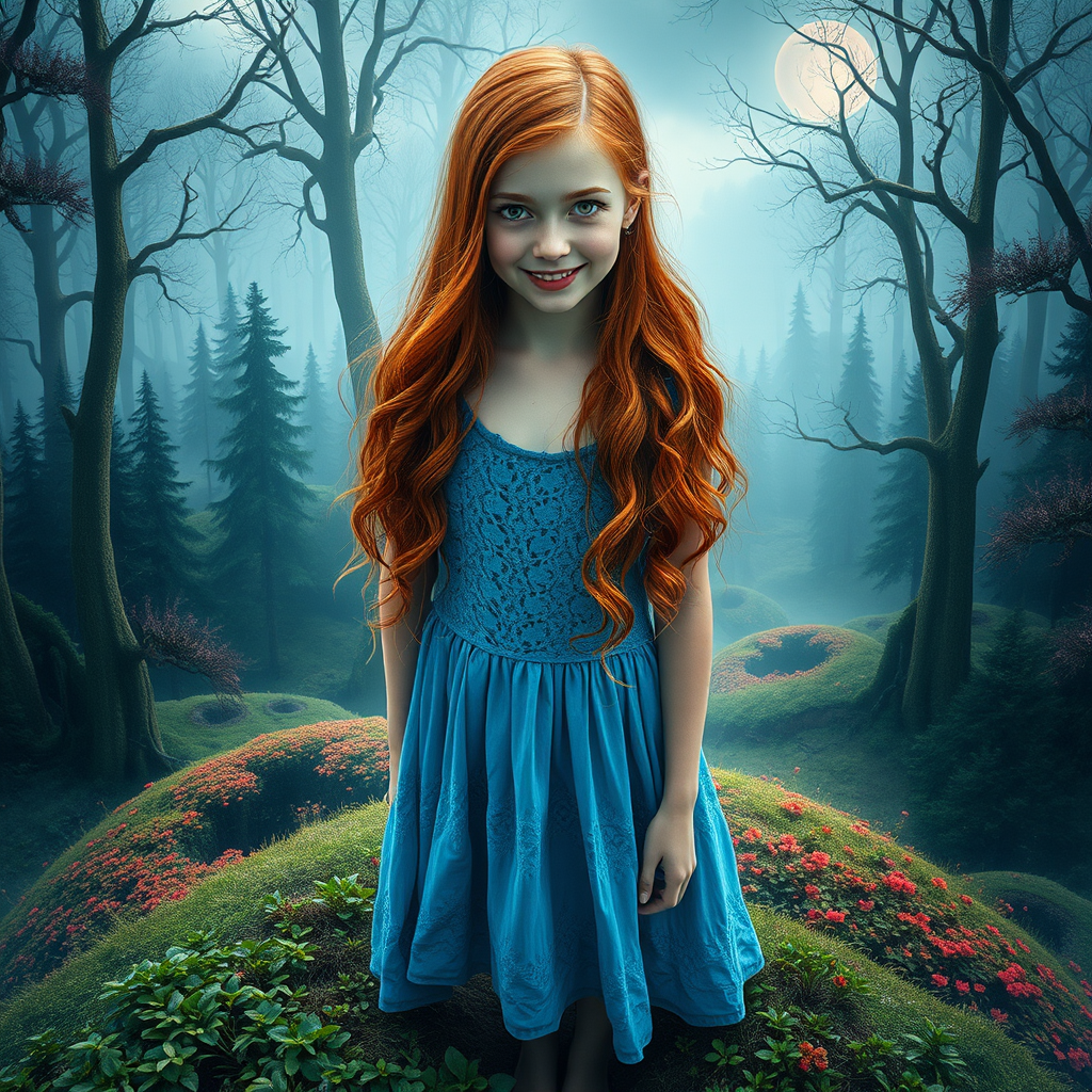 A fantastical landscape blending the allure of a mystical forest and the dark ambiance of Dante's inferno. At the center stands a stunning full-body portrait of an enchanting Nordic red-haired girl, her smile radiant and her delicate feet resting on the lush hill of this ethereal forest. She wears a flowing blue lace dress, her perfect face framed by symmetric hazel eyes with circular irises, captured in a hyperrealistic, ultra-detailed style. The scene is a cinematic masterpiece with intricately detailed artistry rendered in 3D with an octane finish, creating an epic cover photo worthy of trending on art forums. The piece evokes influences of Mucha and Klimt, infused with vibrant colors and a dark, gritty atmosphere reminiscent of Giger's and Beksinski's work. A depiction that promises to be a standout in digital art contests, showcasing ultra-sharp focus and vibrant, high-definition imagery, marking it as an intricate artwork masterpiece in an enchanting yet ominous setting.