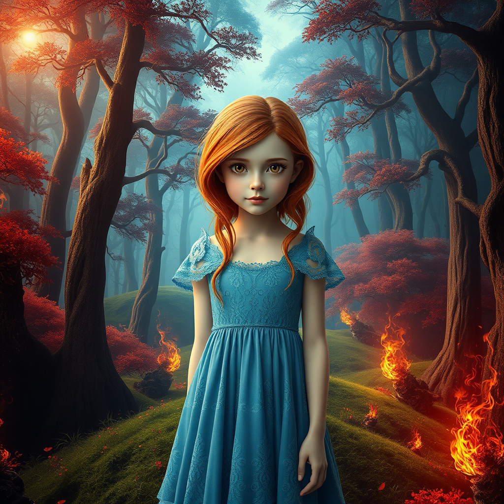 A fantastical landscape uniting the ethereal beauty of a fantasy forest with the intense elements of Dante's Inferno. At the center, a full-body portrait captures a charming Nordic girl with captivating red hair. She wears a flowing blue lace dress, standing on a lush hill amid the magical forest. Her face is perfectly detailed, with symmetric hazel eyes featuring circular irises, displaying a stunningly realistic appearance. This scene is rendered in intricate 3D, with an octane rendering that highlights its cinematic qualities, reminiscent of art styles from Mucha, Klimt, and Erte. The image is ultra-high-definition with vibrant colors, reflecting an epic masterpiece inspired by artists like Tanvir Tamim, Artgerm, and H.R. Giger. The composition is smooth and sharply focused, creating an ultra-realistic digital artwork that is both ominous and enchanting, capturing the imagination in high definition, akin to a Behance contest winner's shot, trending on ArtStation.