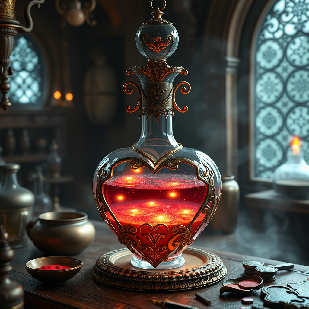 A fantastical love potion contained in an elegantly ornate heart-shaped flask, nestled within an ancient apothecary setting. This enchanting scene is designed as a stunning videogame asset, capturing the essence of magic and fantasy. Rendered in 8k with Cinema4D and Octane Render, the piece boasts extreme detail and high sample quality, inviting a cinematic experience. The atmosphere is infused with intricate artistry reminiscent of Studio Ghibli's work, featuring ethereal lights dancing across the potion's surface, illuminating the rich textures and colors. The scene is imbued with a sense of wonder and mystique, transporting viewers to a world where magic and alchemy intertwine seamlessly.