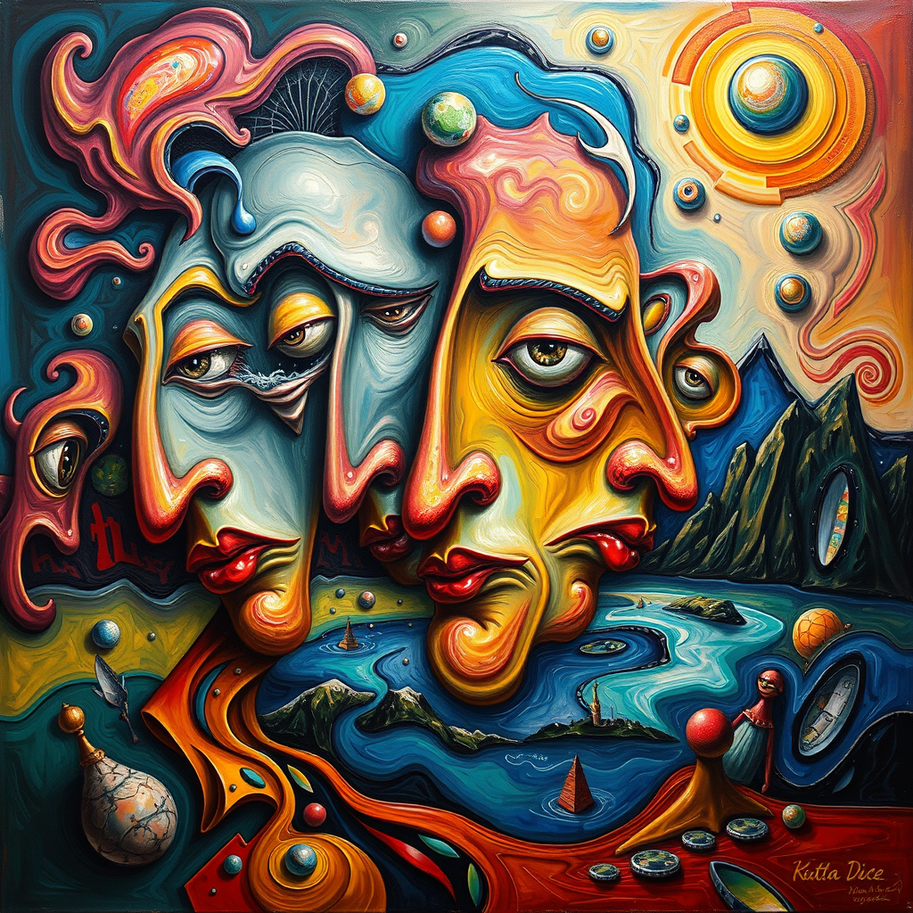 A fantastical painting evoking the essence of Pablo Picasso, featuring distorted and peculiar forms, fluid and melting imagery, vibrant colors swirling in harmony, twisted faces merging into dreamlike landscapes, reflective surfaces bending reality, organic shapes entwined in a dance of abstraction and emotion, a surreal world teetering on the edge of the imaginable.