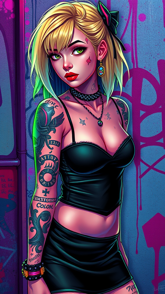 A fantastical portrait of a blonde tattooed girl in a mini dress, inspired by the styles of Atey Ghailan, Greg Rutkowski, Greg Tocchini, James Gilleard, Joe Fenton, and Kaethe Butcher. The image features a vibrant gradient of green, black, and purple with a neon color scheme, capturing a grunge aesthetic set against a graffiti-tagged nightclub wall. The artwork is vivid and dynamic, eschewing conventional beauty standards for a more edgy, expressive look. The setting is lively and bold, highlighting the individuality and personality of the tattooed girl, with an emphasis on artistic flair and creative expression.