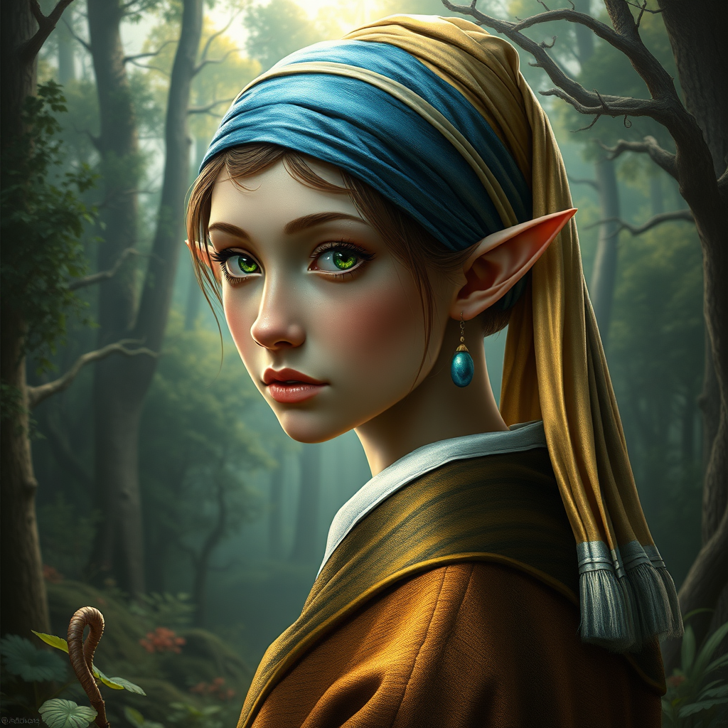 A fantastical portrait of an elven character reminiscent of Girl with a Pearl Earring, set in an enchanting forest, showcasing a highly detailed and imaginative digital art style, reminiscent of works by Dan Mumford, Peter Mohrbacher, and Greg Rutkowski. The elf embodies a fantasy character with intricate detailing, presented in high definition, 4k resolution, capturing the essence of trending art on ArtStation, exhibiting superior quality and high resolution. The image avoids artistic flaws such as incorrect anatomy, extra or missing limbs, poor composition, or any visual distortions. It excludes any text, watermarks, or artist signatures ensuring a clean and captivating visual appeal.