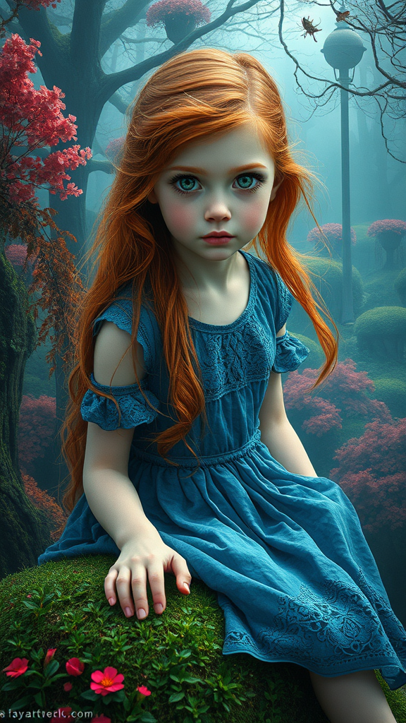A fantastical scene featuring a magical forest infused with elements of Dante's inferno, characterized by vibrant, mystical landscapes. At the heart of this captivating setting is a charming Nordic girl with striking red hair, exuding an innocent allure. Her delicate feet rest upon a lush hill, surrounded by surreal forestry. She is adorned in a flowing blue lace dress, perfectly complementing her intricate, symmetric face and captivating hazel eyes with their distinct circular irises. This portrait radiates an enchanting blend of realism and fantasy, capturing the essence of a cinematic masterpiece. The scene boasts rich, vibrant colors and is meticulously detailed, evoking the artistry of Mucha, Klimt, and Erte. This hyper-realistic, 12k high-definition artwork stands out as a stunning cover photo, echoing the styles of artgerm, H.R. Giger, and Beksinski. The landscape combines epic, ominous elements with a gritty and dark touch, generating a sense of wonder and intrigue.