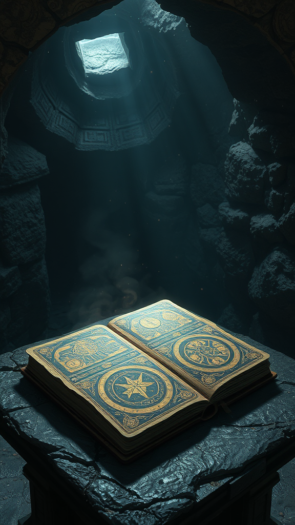A fantastical spellbook rests on an ancient stone table deep within the shadowy catacombs, its surface adorned with intricate, hyper-detailed engravings and mystical symbols that glow in the low light. The scene is captured in an incredibly detailed and lifelike style, with an octane-rendered, unreal engine aesthetic that brings the surroundings to life in stunning 8k resolution. The spellbook is open, its pages rich with vibrant and otherworldly illustrations, seemingly inspired by the collaborative artistry of Greg Rutkowski, Peter Mohrbacher, and Magali Villeneuve. Surrounding the book, ethereal wisps of magic waft through the air, casting a subtle, enchanting aura over the aged stonework, with scattered beams of light filtering through cracks in the ceiling, illuminating the elaborate details and lending an air of mystery to the scene.