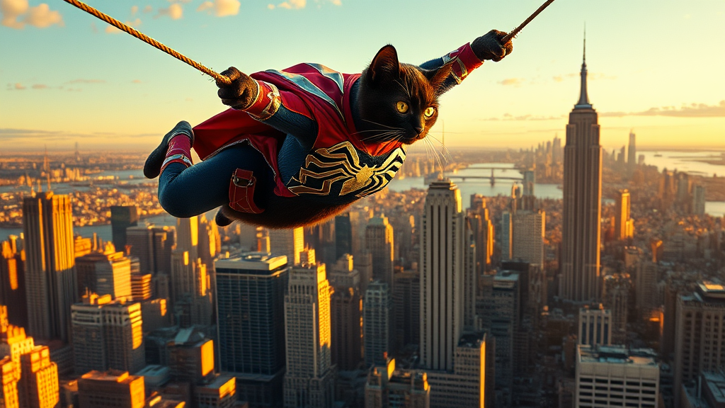 A fantastical vision of the incredible Spidercat, a superhero feline donned in a spiderman-inspired costume, soaring gracefully over the iconic skyline of New York City using its intricate web. The scene is captured with hyperrealistic precision, showcasing cinematic lighting that bathes the cityscape in a golden glow. Every detail of Spidercat's costume and the urban environment is rendered with high-definition clarity, resulting in a breathtaking masterpiece with a resolution of 32k UHD. Set against a dynamic aspect ratio of 5:7, this image stands as a testament to perfect artistry and imaginative storytelling.