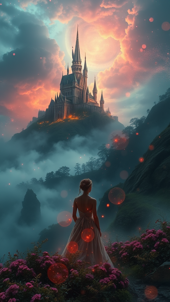 A fantastical world where dreams merge with reality, showcasing a surreal image born of a beautiful and vivid imagination. The scene is intricately detailed, captured in 8K resolution, enveloped in a misty, colorful yet dark atmosphere that whispers the secrets of life. Dynamic lights dance across the landscape, reminiscent of the style of Jesper Ejsing. In the foreground, a mesmerizing fantasy princess gazes out over a mystical landscape, where a magnificent castle rises in the distance. The entire setting is breathtakingly beautiful, filled with an aura of wonder and mystery.