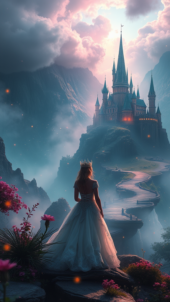 A fantastical world where dreams take shape into reality, featuring a surreal image born of a beautiful and vivid imagination, meticulously detailed in 8k resolution. A misty yet colorful ambiance with a touch of darkness envelops the scene, hinting at the secrets of life. Dynamic lights dance around as a fantastical princess gazes upon a breathtaking landscape complete with a majestic castle. The scene evokes the artistry and style reminiscent of Jesper Ejsing, offering an enchanting blend of beauty and mystery.