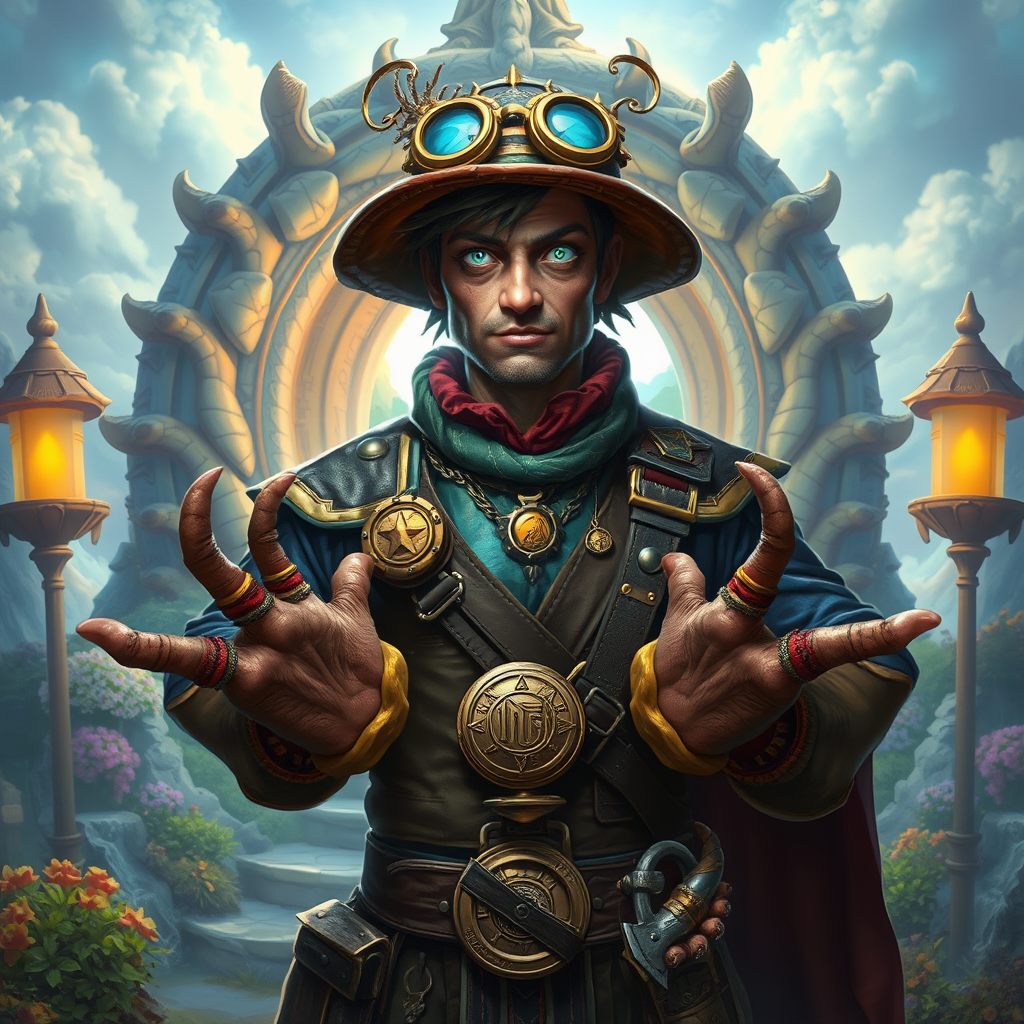 A fantasy adventurer in the unique style of John Blanche stands before a mystical portal leading to a serene, enchanting world. The adventurer is adorned in eclectic, award-winning attire, exuding an aura of mystery and courage. The scene is depicted in ultra-high-definition with vibrant colors and dynamic lighting, capturing every intricate detail. The adventurer's eyes glint with curiosity and determination, though they appear slightly crossed, offering a whimsical touch. His hands, featuring extra fingers and peculiar mutations, rest assuredly on his hips as he contemplates the journey ahead. The background is a fantastical blend of surreal and welcoming elements, creating a harmonious contrast to the adventurer's gritty presence. The image is meticulously crafted, free of distractions like watermarks or text, allowing the viewer to be fully immersed in the imaginative world.