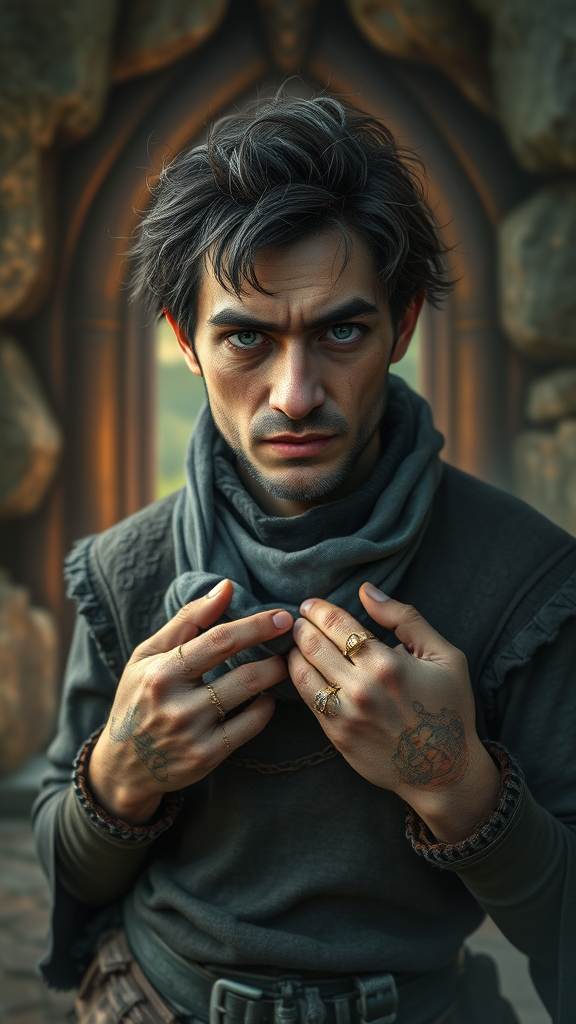 A fantasy adventurer, styled in the intricate and detailed manner of John Blanche, stands resolute before a portal that leads to a slightly more serene world. The ambiance is rich with color, framed in 16k resolution with UHD and HDR quality, capturing every detail of the scene. The adventurer sports an enigmatic expression, their features subtly unusual with a hint of quirkiness, suggesting a face that is both familiar and unique. Their hands show a curious mix of traits, hinting at past magical encounters. The surrounding atmosphere blurs slightly at the edges, creating a dreamlike transition between worlds. Textures in the artwork reveal a distinctive, almost aged quality, avoiding any signatures or watermarks. The composition is dynamic yet intimate, encapsulating the adventurer's readiness to explore new realms.