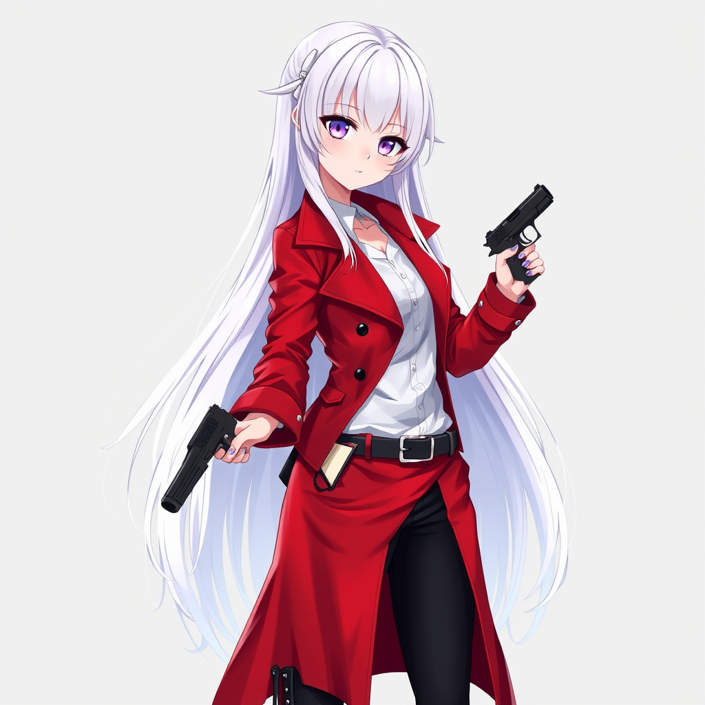 A fantasy anime-style female character with long white hair and clear purple eyes, showcasing a clear face adorned with perfect eyes, a cute face, and red lips that form a seductive expression. She is dressed in a striking red trench coat worn over a white shirt, paired with black pants and black boots, accentuated by a black belt. In her right hand, she confidently holds a pistol. This digital art piece emphasizes high quality, high definition, and high resolution visuals, with an emphasis on clean lines and vibrant colors to bring the character to life in a single, captivating full-body portrait.