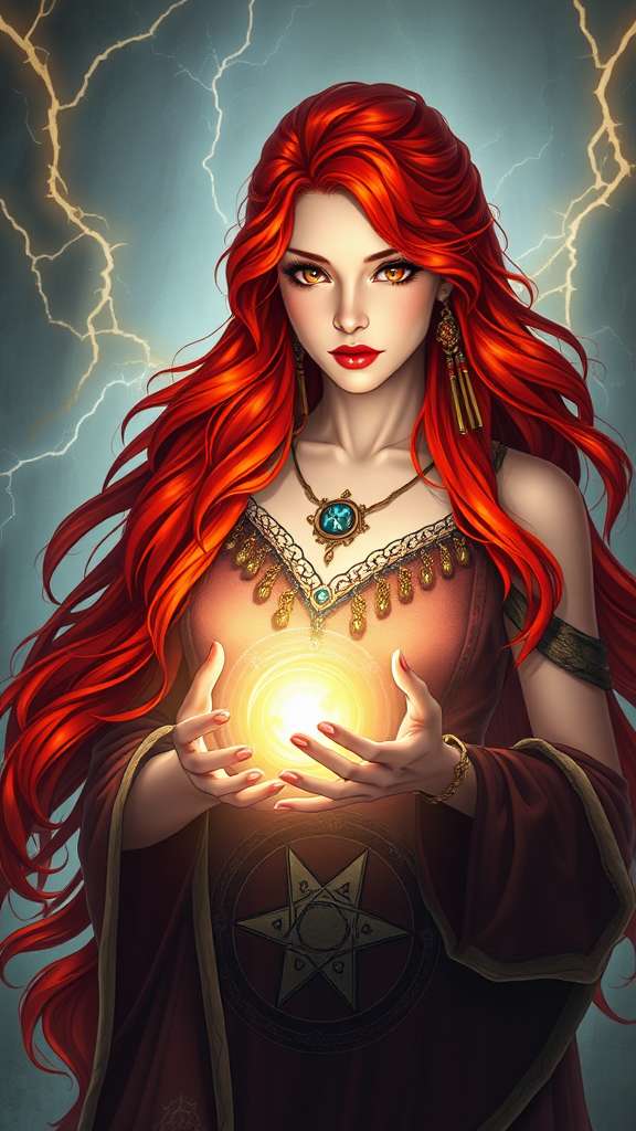 A fantasy artwork depicting a woman with cascading, vibrant red hair reminiscent of Amy Adams, set against a mystical backdrop. She holds a radiant, glowing orb in her hands, casting an ethereal light. Her presence exudes an air of mystery and power, as she carries a pentagram shield. Her eyes sparkle with the knowledge of a lightning mage, while her serene expression reflects her wisdom as a benevolent android necromancer. She embodies the essence of the high priestess from a tarot card, combined with the elegance of a Celtic goddess akin to Diana. Her form is anime goddess-like, merging realism with fantasy, and would be fitting for a feature on prominent art platforms like CGSociety or ArtStation.