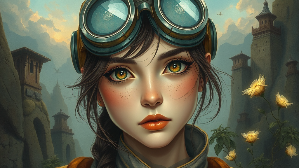 A fantasy artwork depicting a woman with goggles perched on her head, intricately illustrated by an artist inspired by Rudy Siswanto. Her eyes gleam with curiosity and determination, set against a backdrop of mystical landscapes. The realism in her expression and attire contrasts beautifully with the ethereal and otherworldly elements surrounding her. The scene hints at a mysterious quest, with subtle details suggesting slight deviations from conventional forms, enhancing its surreal charm. The enigmatic ambiance is underscored by imaginative creatures and faintly luminescent flora interwoven into the composition.