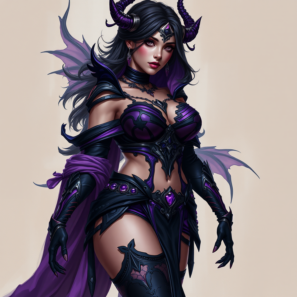A fantasy goddess woman inspired by Kitana, adorned in luxurious purple and black attire, including a short skirt and intricate, elegant clothing. Her figure is voluptuous, with striking, detailed features—a flawless face with soft, radiant skin. Rendered in a style reminiscent of Greg Rutkowski and Artgerm, this concept art showcases hyperdetailed and intricately designed gothic elements, set against a triadic color scheme. The piece is a fantastical vision, with vibrant complementary colors. Created as a high-resolution, 8k masterpiece in the style of a gothic oil painting, it incorporates heavy brushstrokes and detailed textures, evoking a sense of otherworldly beauty. Despite the fantastical theme, the focus remains on maintaining harmonious anatomy and proportions, ensuring a captivating and aesthetically pleasing representation.