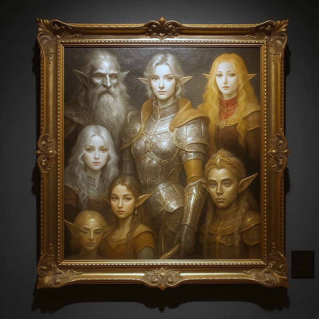 A fantasy painting displayed in an art gallery, showcasing intricately detailed character illustrations with a palette of shimmering silver and amber hues. The hyperrealistic scene captures charming characters with expressive, detailed faces, surrounded by delicate accents of light gold and vibrant red. The style evokes a sense of raw, artistic depth, reminiscent of detailed sculptures and rich storytelling.