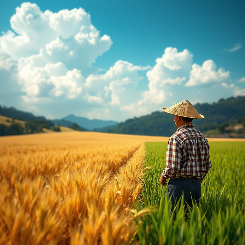 A farmer in a straw hat stands amidst vast golden wheat fields under a sky adorned with large, billowing clouds and a serene blue hue. Nearby, a rice field flourishes with perfectly aligned green seedlings, juxtaposed against the soft backdrop of a quiet hillside and a lush forest. The scene captures a sense of seclusion and rural tranquility, rendered with hyper-detail and a cinematic touch. Soft, surreal light casts gentle shadows, while deep field focus enhances the scene's depth, creating a bokeh effect that imbues the landscape with a dreamlike quality. This surreal interplay of elements is further enriched by the artful use of ray tracing, adding a layer of mystique and wonder.