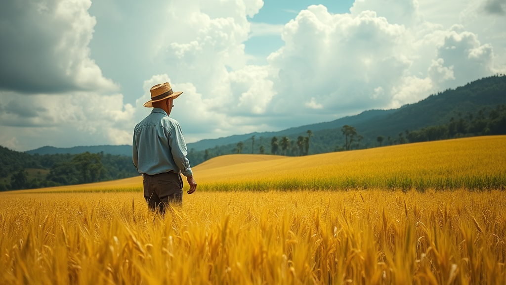 A farmer uncle in a straw hat stands amidst a golden wheat field, under a vast sky filled with towering clouds. Nearby, a lush rice field displays rows of neatly arranged seedlings. A distant forest blankets the hillside, creating a secluded, rural scene. Rendered with high-definition detail, each element appears in hyper-detail, evoking a cinematic, surreal atmosphere. Soft light bathes the landscape, enhancing the deep field focus with a bokeh effect, while ray tracing adds a mystical touch to the surreal environment.