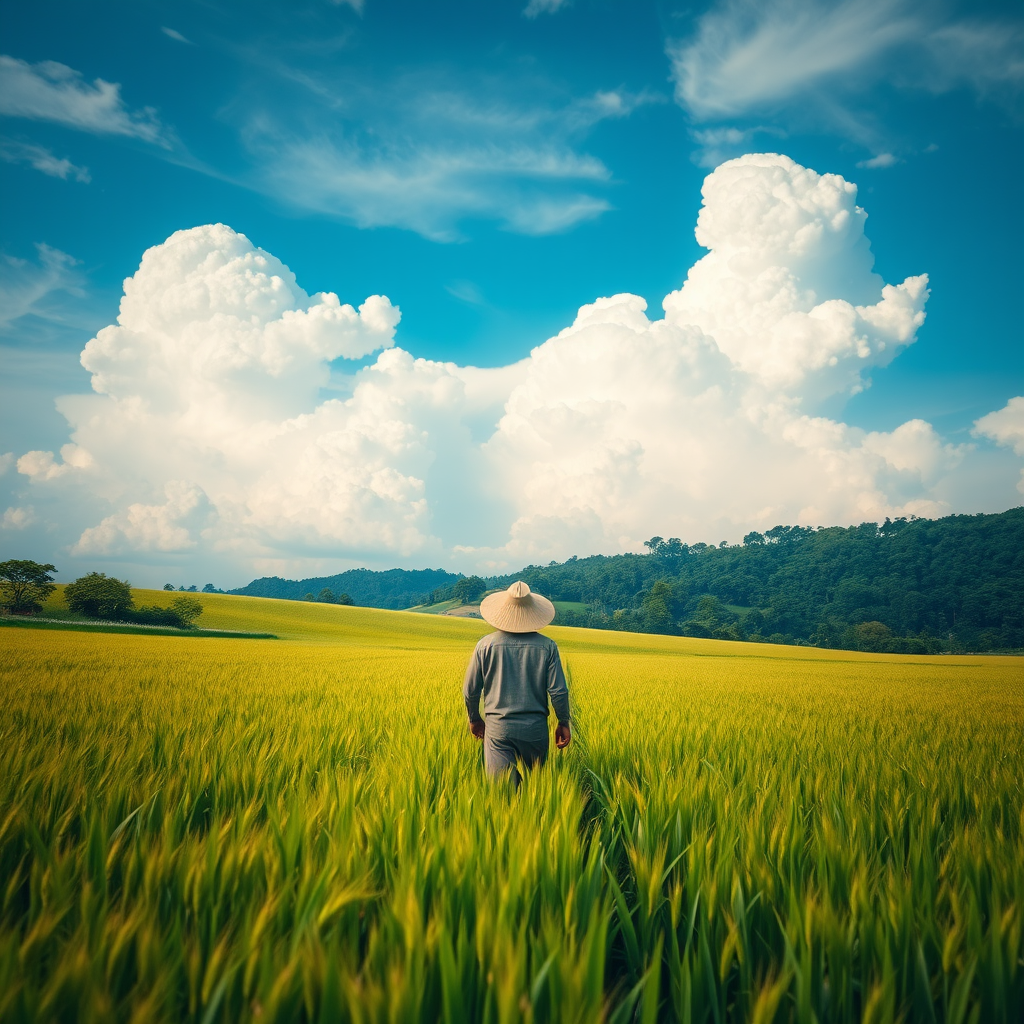 A farmer wearing a straw hat stands amidst a vast wheat field under an expansive blue sky dotted with enormous clouds. Nearby, a well-maintained rice field showcases neat rows of vibrant green seedlings. In the distance, a lush forest blankets the hillside, adding to the secluded rural charm. This highly detailed, cinematic scene is suffused with soft light, creating a surreal atmosphere that blurs the boundaries between reality and imagination. The deep field focus and subtle bokeh effect are enhanced by advanced ray tracing techniques, further amplifying the surrealism of the landscape.