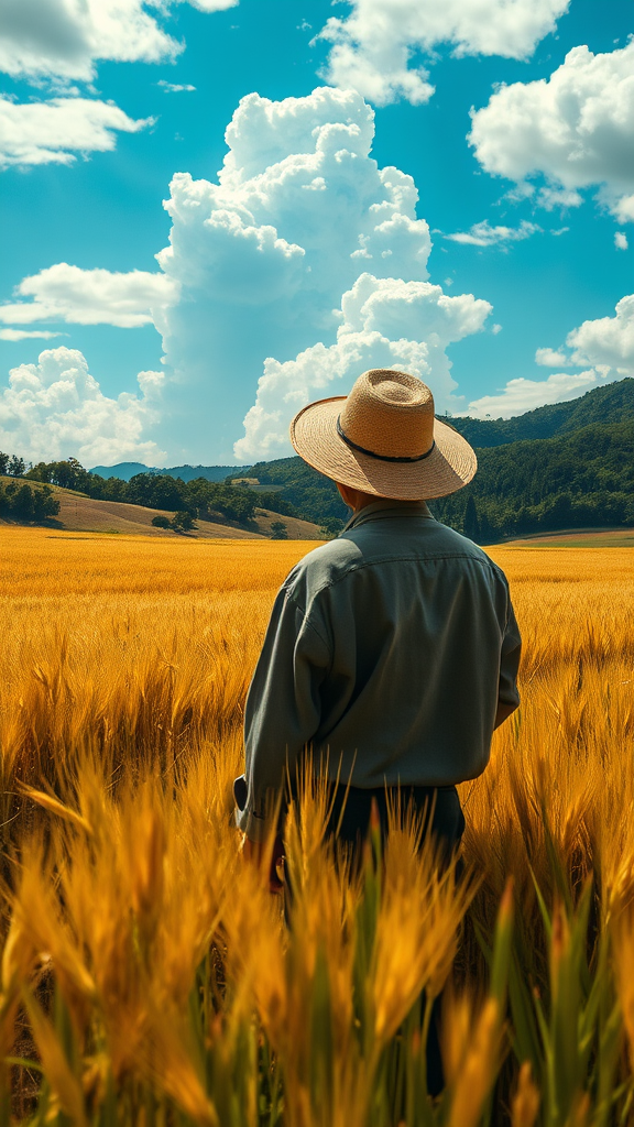 A farmer with a straw hat stands amidst golden waves of a wheat field, beneath towering clouds in a vivid blue sky. Nearby, a rice field reveals neat rows of seedlings, nestled against a backdrop of lush forest and gentle hillsides. The scene is secluded and rural, captured with HD detail and hyper-detail, blending cinematic and surreal elements. The soft light bathes the landscape, creating deep field focus and a gentle bokeh effect that evokes a sense of timeless serenity. The intricate play of light and shadow, enhanced by advanced ray tracing, adds to the surreal beauty of this pastoral tableau.