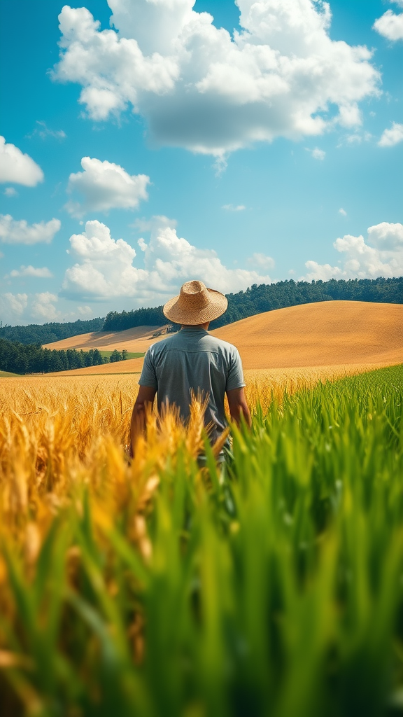 A farmer with a worn straw hat stands amid golden waves of wheat under a vast sky, where clouds gather in soft billows against cerulean blue. Adjacent, a rice field displays rows of neatly planted seedlings, their vibrant green contrasting with the golden crop. A distant hillside, cloaked in dense forest, frames the rural scene, offering a sense of seclusion and tranquility. The landscape, rendered in cinematic hyper-detail, blends elements of realism and surrealism, with soft, diffused light casting gentle shadows. In the foreground, a deep field focus creates a bokeh effect, adding depth to the scene and enhancing the intricate textures, while ray tracing techniques imbue the image with an ethereal quality.
