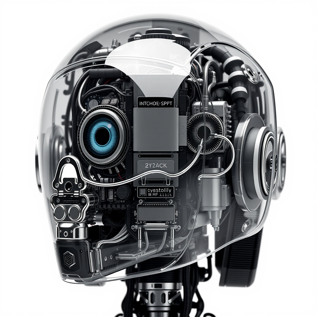 A fascinating, award-winning fully transparent robot with a captivating design concept. The polycarbonate casing reveals a complex network of PCBs, wires, and microelectronics, offering a visually breathtaking spectacle of technology. Set against a white background with screen space reflections and glass reflections, the color palette is well-chosen, enhancing the detailed, innovative, and cutting-edge mechanical concept. The robot features a unique deformed iris and pupils, giving it an unusual visual charisma. The artwork is semi-realistic and slightly abstract, emphasizing intriguing imperfections. It remains monochrome and intentionally incorporates elements reminiscent of lower quality, like greyscale tones and subtle blur, lending to its artistic style. Characteristics such as a noticeable nose and a sense of cropped focus add intrigue. The artwork avoids typical pitfalls such as text, jpeg artifacts, signatures, watermarks, or any identifying artist marks, retaining the clean and mysterious allure of the concept.