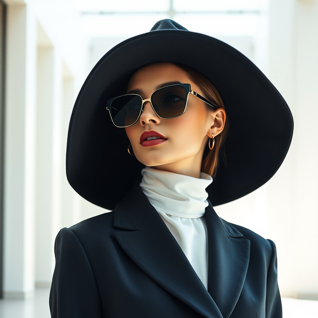 A fashion design photo showcasing a female model in minimalist women's attire, complemented by a large stylish hat and designer sunglasses, captured in a Bauhaus-inspired architectural setting. The scene is bathed in bright, soft lighting to highlight the sleek, sophisticated style, exuding an air of high-end allure. The composition emphasizes fine lines and delicate details, with realistic anatomies ensuring authenticity. Shot with a Nikon D800, the image embodies elegance with a touch of artistic creativity, emphasizing simplicity and grace.