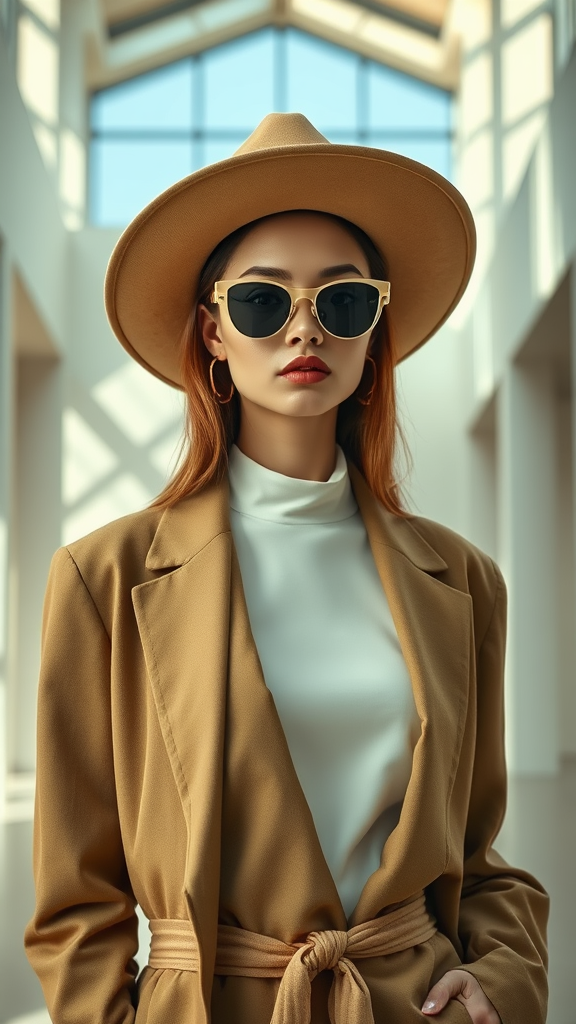 A fashion design scene showcasing a female model in minimalist women's attire, styled with an oversized hat and Gucci sunglasses, photographed in a modernist Bauhaus building bathed in soft, natural light. The composition emphasizes a minimalist and sleek aesthetic, exuding sophistication and high-end appeal, with precise lines and intricate detailing, capturing realistic anatomies and elegance, shot on a Nikon D850 for enhanced detail and richness.