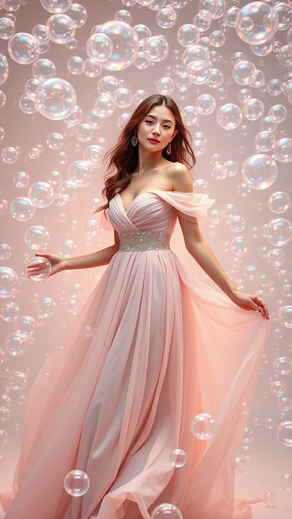 A fashion editorial photograph featuring a model surrounded by iridescent bubbles, wearing a ethereal light pink evening gown. She poses gracefully in a sleek photostudio filled with a multitude of shimmering bubbles that catch the light and evoke a dreamy, whimsical atmosphere. The dress flows elegantly around her, adorned with subtle hints of sparkle that complement the reflective surface of the bubbles. The overall scene creates a sense of fantasy, where elegance and playfulness blend seamlessly in a 3:4 aspect ratio composition.
