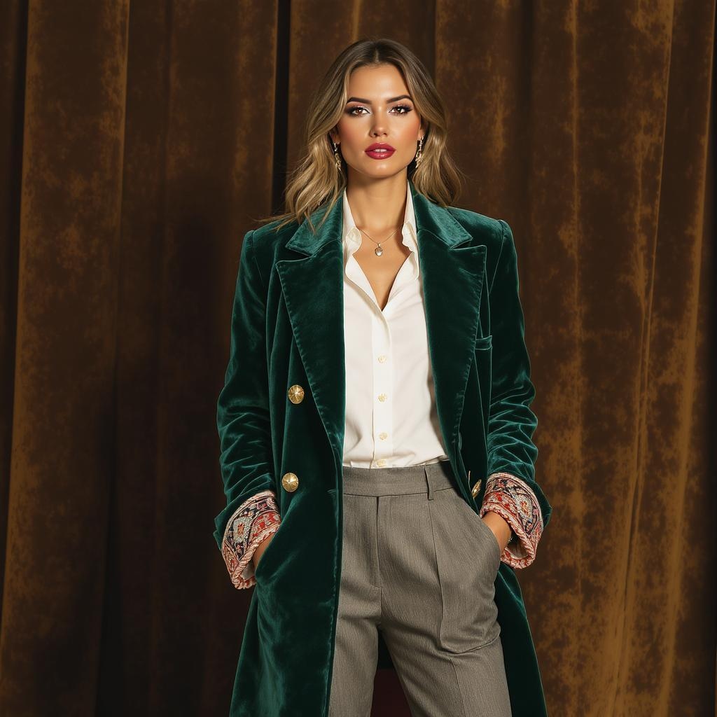 A fashion-forward woman model poses elegantly against a textured dark brown backdrop, exuding confidence and style. She is adorned in a luxurious emerald velvet coat, subtly redesigned with intricate Persian carpet-inspired motifs accentuating the cuffs and collar. Beneath the coat, she wears a crisp ivory blouse that softly contrasts with her tailored taupe trousers. Her look is completed with tasteful gold accessories, adding a touch of sophistication to the ensemble.