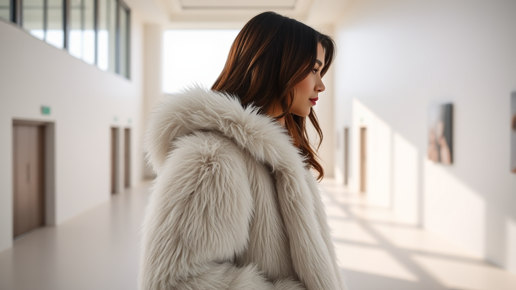 A fashion-forward young woman wearing a luxurious fluffy jacket stands in an expansive, minimalist museum hall, positioned on the right side. She gazes thoughtfully towards a large window, where soft, natural light enhances the serene atmosphere. The space is adorned with sleek, white walls, giving it an airy, contemporary feel. The overall composition balances elegance and modernity, highlighting the interplay of light and texture in a setting that emphasizes quiet sophistication.