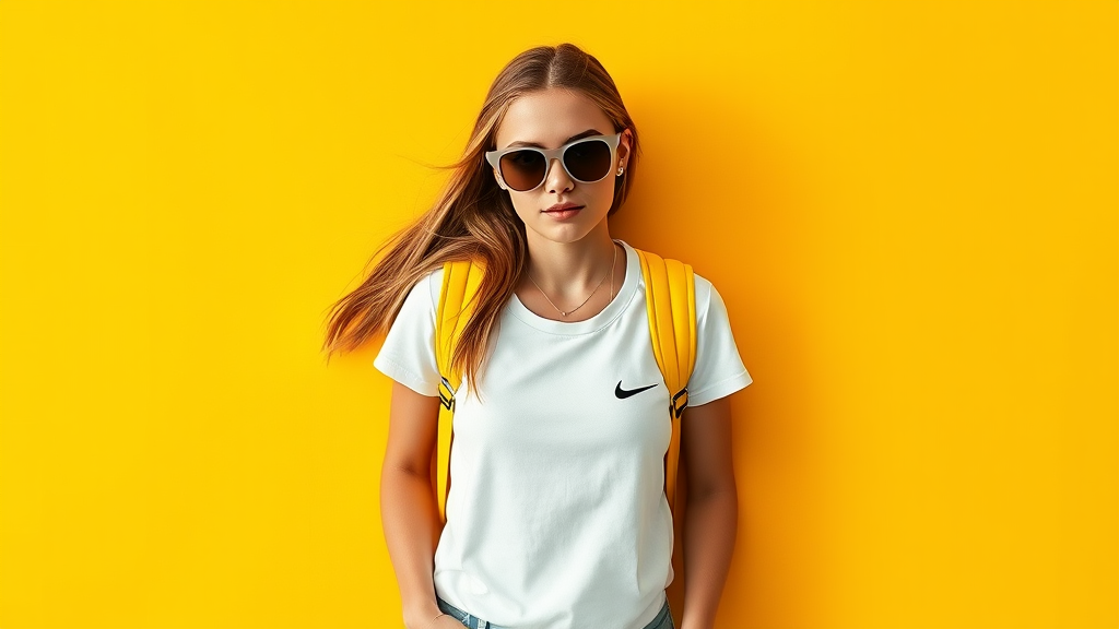 A fashion-loving American girl is captured in a full-body portrait, embodying a beach vibe with her chic ensemble. She dons a pair of sleek sunglasses and a crisp white T-shirt adorned with a subtle Nike logo. Her look is effortlessly completed with a pair of spotless white sneakers and a vibrant yellow backpack slung over her shoulder. Against a backdrop that emphasizes the main color #ff7ad2, the scene is arranged with knolling principles, showcasing each element with precision and balance. The image is high-definition and photorealistic, shot from above to include every detail in an 8k resolution. This data visualization-style composition offers a harmonious blend of style and structure, inviting the viewer to appreciate the minimalist yet impactful aesthetic.