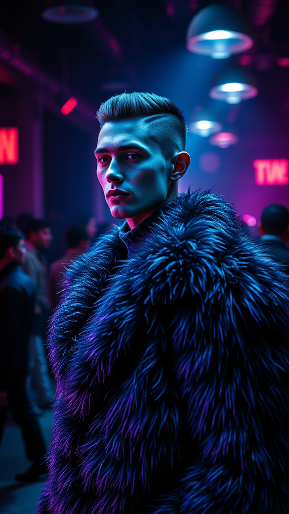 A fashion magazine spread featuring a full-body image of a man with sleek, short hair and defined facial features, adorned in a futuristic fur coat with iridescent textures. The setting captures the dynamic energy of a darkened space where blurred silhouettes of people move around under pulsating lights. Enveloping the scene are striking hues of black, electric blue, deep purple, and vivid neon, evoking a dreamlike atmosphere reminiscent of Tim Walker's avant-garde style.