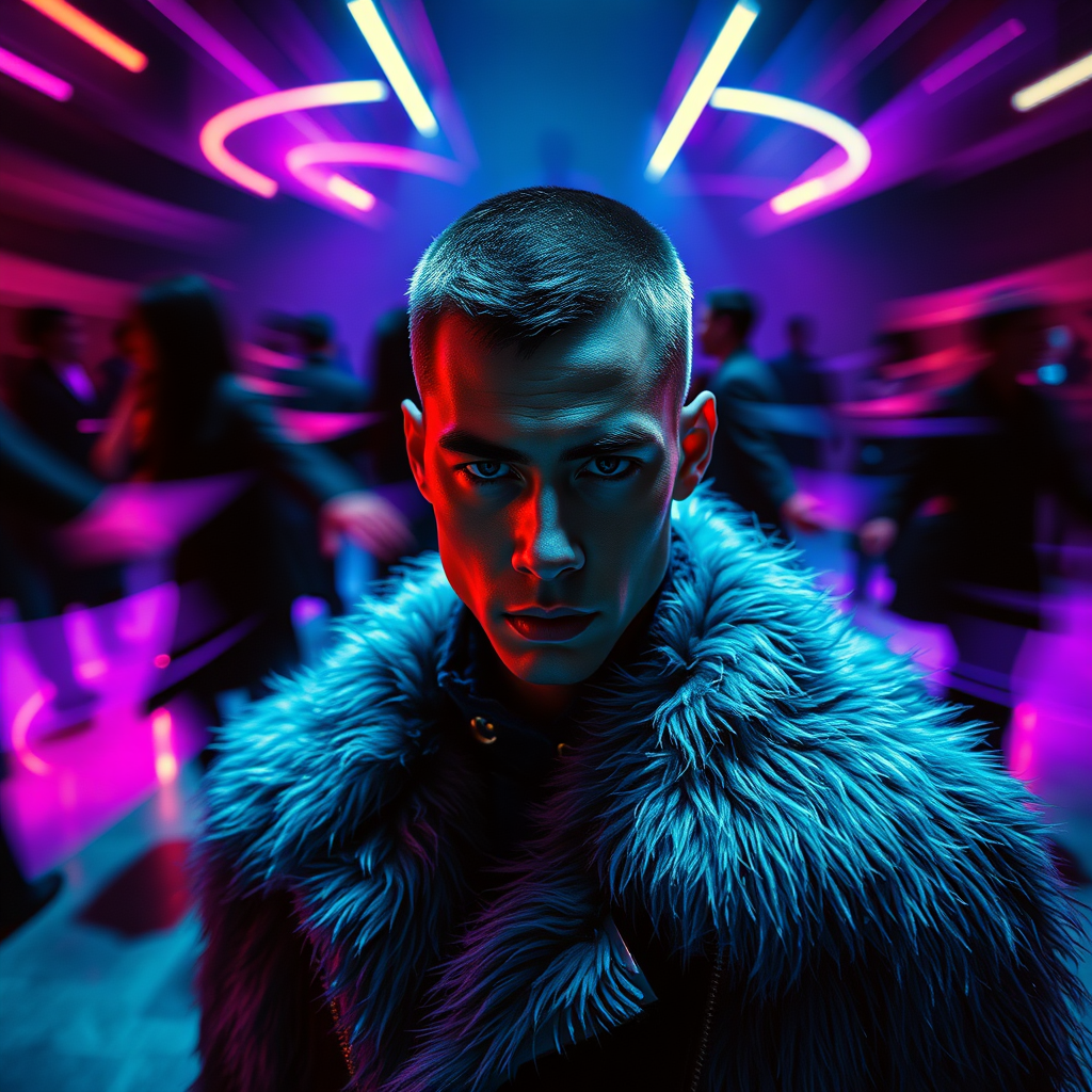 A fashion magazine spread presents a striking full-body photo of a man with angular facial features and short, sleek hair. He is adorned in an avant-garde fur coat with metallic accents that shimmer under dynamic lighting. The background is a hypnotic scene, featuring blurred silhouettes of people swirling in motion, their movements creating an abstract dance in a dimly lit environment punctuated by vibrant beams of light. The color palette is a harmonious blend of deep blacks, electric blues, rich purples, and luminous neon tones, evoking a sense of cosmic energy, reminiscent of the ethereal and imaginative style of Tim Walker.