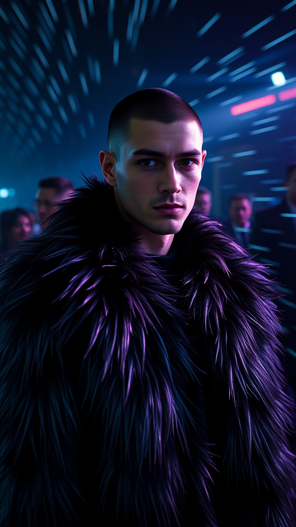 A fashion magazine spread showcasing a full-body photo of a man with cropped hair and chiseled facial features. He is adorned in an avant-garde fur coat that shimmers with iridescent hues. The backdrop is a dynamic scene, with silhouettes of people in motion, their forms blurred against a dimly lit space. Pulses of light in shades of black, deep blue, and electric purple cascade over them, casting a surreal glow reminiscent of a Tim Walker masterpiece.