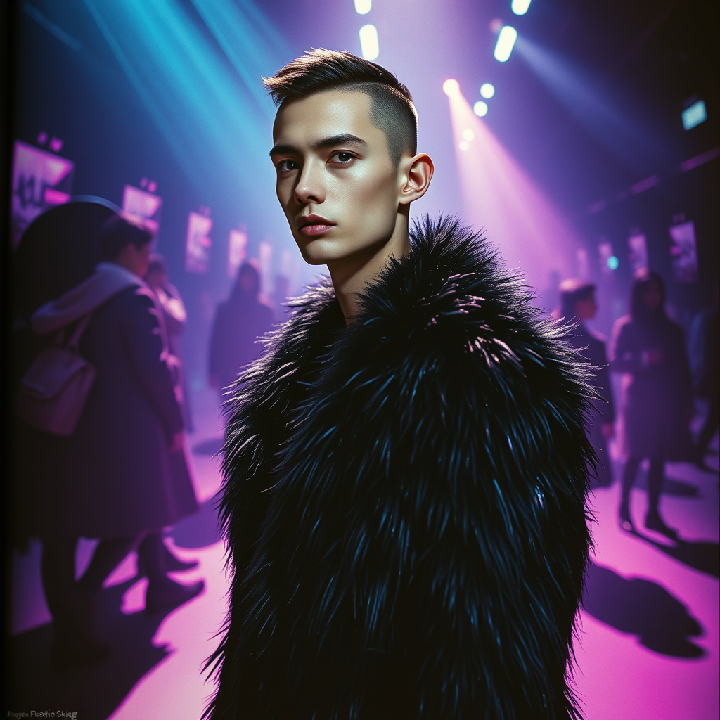 A fashion magazine spread showcasing a striking full-body photo of a man with angular facial features and sleek, short hair, clad in an avant-garde fur coat with metallic and holographic elements. The backdrop features an ethereal, dreamlike scene with distorted silhouettes of people in motion, casting elongated shadows and bathed in a play of dark and vibrant lights. The color palette melds intense blacks, deep blues, and rich purples with splashes of electrifying neon, evoking an atmosphere reminiscent of Tim Walker's whimsical yet sophisticated style, awash with a surreal, otherworldly ambiance.