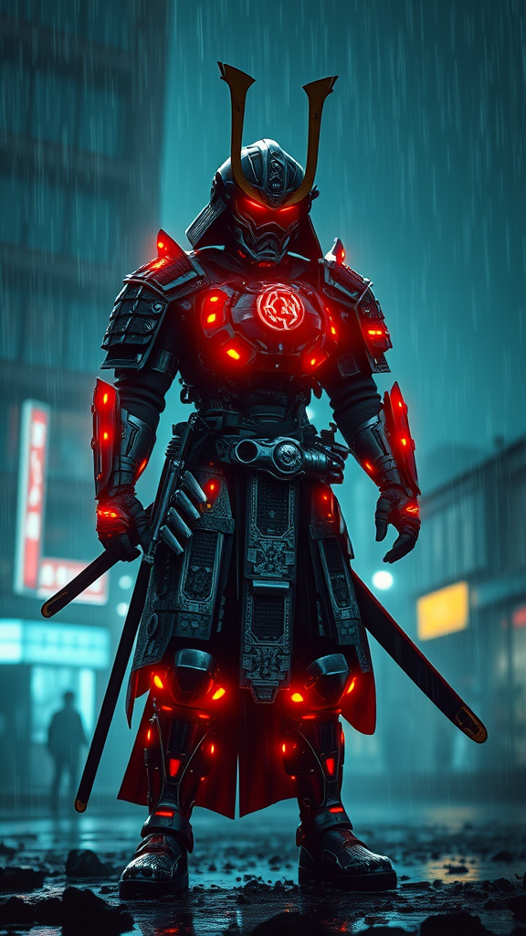 A fearless cyborg samurai stands alone in cyberpunk armor, glowing elements illuminating the intricate details of its armor under a rainy night sky. The scene is epic and emotionally profound, capturing the warrior's proud pose in digital art, influenced by the styles of Milo Manara and Russ Mills. The dramatic lighting enhances the unforgettable atmosphere, with the intricate design showcasing an impressive level of detail. The composition and angle elevate the artwork, eliminating any distracting artifacts or deformities, presenting a visually striking and well-proportioned figure without unnecessary elements.