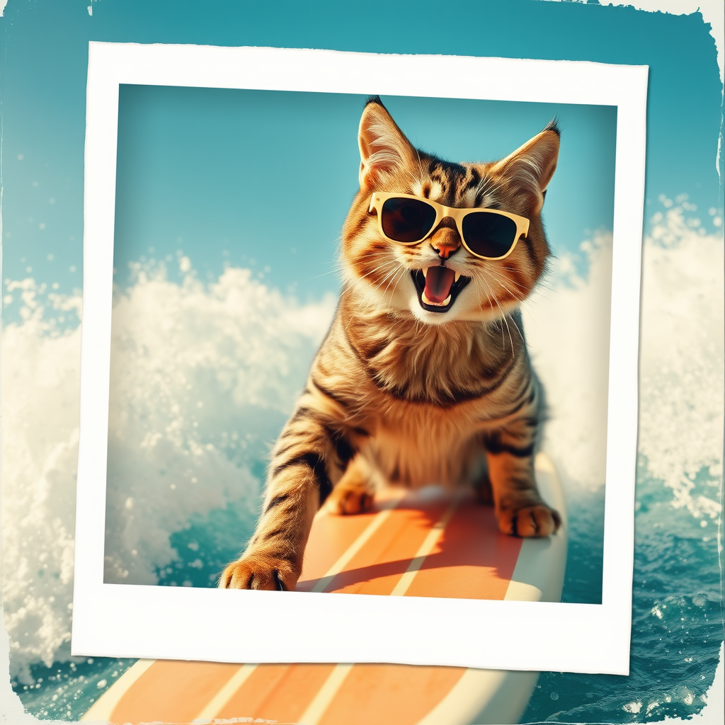 A fearless tabby cat rides a surfboard amidst towering waves, its fur slightly dampened by the ocean spray. The cat sports stylish sunglasses, eyes gleaming with excitement, and its mouth is open in a spirited meow, embodying pure adrenaline. Captured in a retro-style polaroid photo, the image frames the thrilling moment against the sunny, azure sky, its edges weathered like a cherished summer memory.