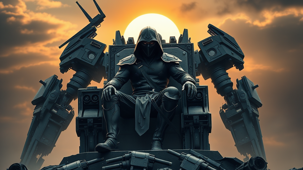 A fearless warrior clad in a meticulously designed futuristic black ninja suit sits regally atop a throne assembled from the remnants of defeated robots, showcasing flawless body proportions. The aesthetic is reminiscent of a Soviet-era poster with undertones of anime and manga art, enveloped in rich, dark hues. Behind him, a damaged robot mech looms, serving as a testament to his might amidst the dawn's soft illumination. The scene is rendered with high detail and cinematic lighting, capturing the epic grandeur in offset printing style, providing a striking 8K, HD, CMYK visual that evokes the power and struggle of this futuristic odyssey.