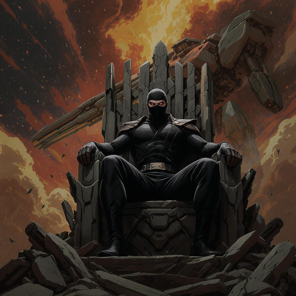 A fearless warrior in a sophisticated, sleek black ninja suit sits triumphantly on a throne crafted from the remains of defeated robots, his body perfectly proportioned and exuding strength. The style mirrors a classic Soviet poster, evoking the boldness of USSR-era design. Behind him lies a damaged robot mech, hinting at the epic battle fought at the break of dawn. The scene is depicted in anime and manga style, incorporating dark, moody colors with a high level of detail reminiscent of offset printing. The cinematic lighting bathes the scene in a dramatic glow, capturing the hero in sharp 8K HD resolution with a CMYK color scheme, creating an epic, dynamic poster that celebrates victory and resilience.