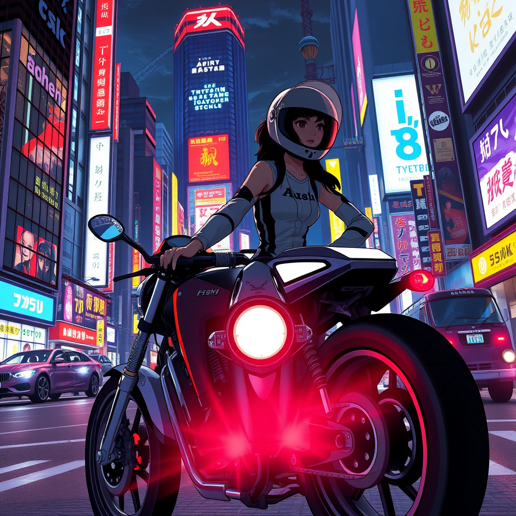 A fearless woman in a sleek helmet navigates the bustling streets of NeoTokyo on her motorcycle, under neon-lit skyscrapers and glowing billboards. Her retrofuturistic bike hums with a distinctive 80's anime flair, evoking the dynamic spirit of Akira. The night air is electric with anticipation as she weaves through the vibrant cityscape, her silhouette a thrilling blend of classic anime style and futuristic edge. The scene is alive with the pulse of a world where nostalgia and innovation collide, painting an unforgettable image of freedom and adventure.