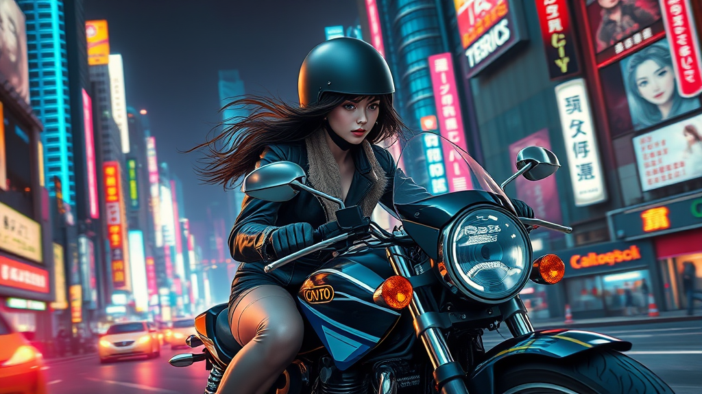 A fearless woman with windswept hair beneath a sleek helmet rides her motorcycle through the neon-lit streets of NeoTokyo. The cityscape, reminiscent of the 1980s anime aesthetic, glows with retrofuturistic vibrancy. Her ride reflects the classic Akira style, weaving through a bustling world of towering skyscrapers and floating holograms, capturing the essence of a dynamic, electrifying night.