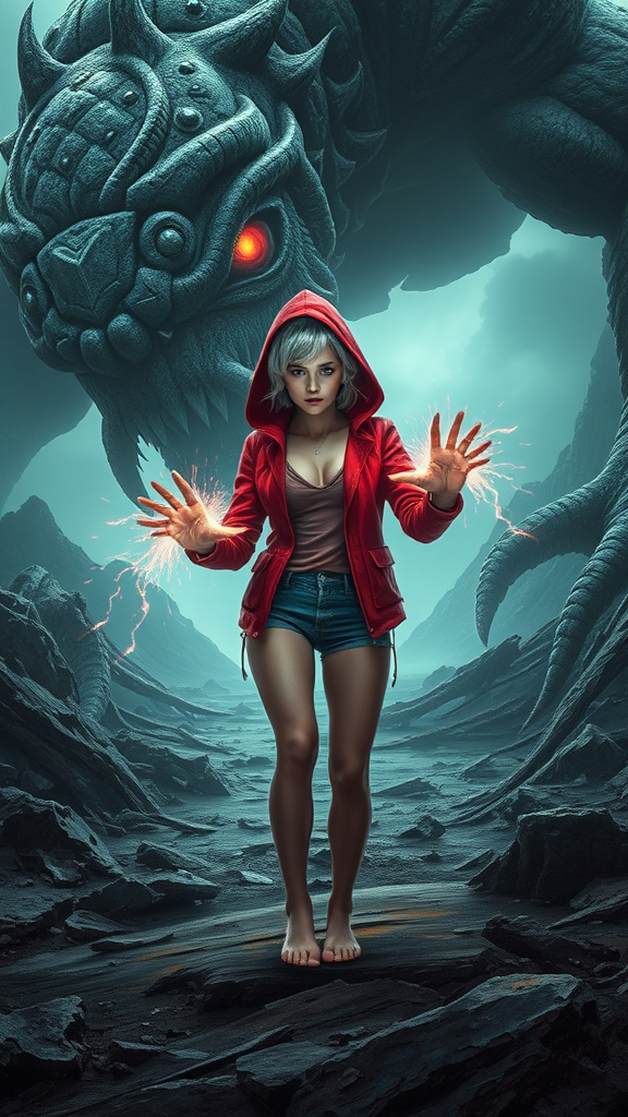 A fearless young woman with shimmering silver short hair emerges from beneath a chic hooded crimson jacket, her piercing eyes focused with determination. Wearing short denim jeans and standing barefoot on the jagged terrain, she engages a colossal monster in an eerily beautiful and decimated world. Mysterious energy pulses from her hands, casting an otherworldly glow. The backdrop showcases hyperdetailed post-apocalyptic surroundings brought to life through luminism, octane render, and bar lighting. The scene is intricately crafted in 8k resolution, reminiscent of the art styles of Martina Fačková, Prywinko Art, Artgerm, WLOP, and masters like Alphonse Mucha, Tony Taka. Fractal isometric details blend with bioluminescent elements to enhance the realistic, yet surreal scene. The visual intensity captures a cinematic, gritty essence, comprising a mix of bold dark and loose lines, akin to the strokes of da Vinci or Erté. This captivating artwork portrays a striking contrast of vibrant colors and lifelike features, embodying a masterful, hyperrealistic 12k concept art portrait.