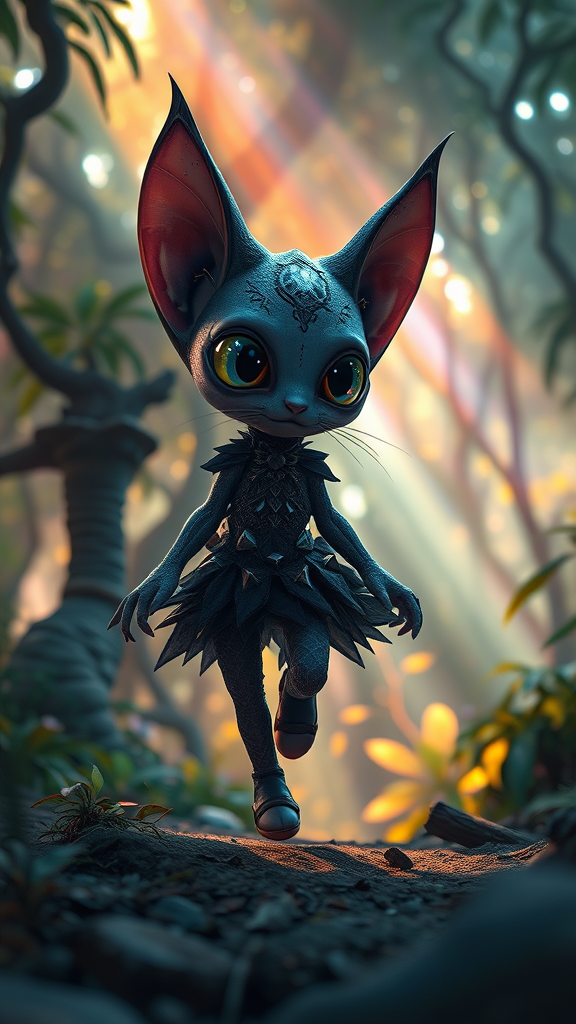 A fearsome big-eyed celestial squid kitten adorned in a dark spiked dress gracefully navigates a vibrant alien forest, with shafts of rainbow light filtering through the dense canopy. This full character concept captures an ethereal scene, reminiscent of trends on ArtStation, blending the intricate techniques of matte painting and animation lighting. It features a shallow depth of field and extraordinary detail, creating an immersive experience in a 9:16 aspect ratio.