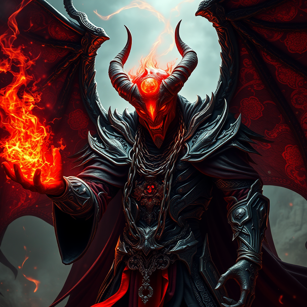 A fearsome demon clad in intricate, enchanted armor weaves dark magic through the air, his imposing frame shrouded in flowing black and blood-red cloaks. His head, a pulsating sphere of crimson energy, casts an eerie glow, illuminating the menacing chains draped across his chest. Set against the epic backdrop of a world echoing with the grandeur of Lord of the Rings and the mythic adventures of Dungeons and Dragons, the entity exudes an aura of ancient power. His every movement is rendered in stunning 4k ultra-realistic detail, each shadow and glint brought to life as if crafted by the hands of an unreal engine, as he stands as a formidable sorcerer in a realm where fantasy knows no bounds.